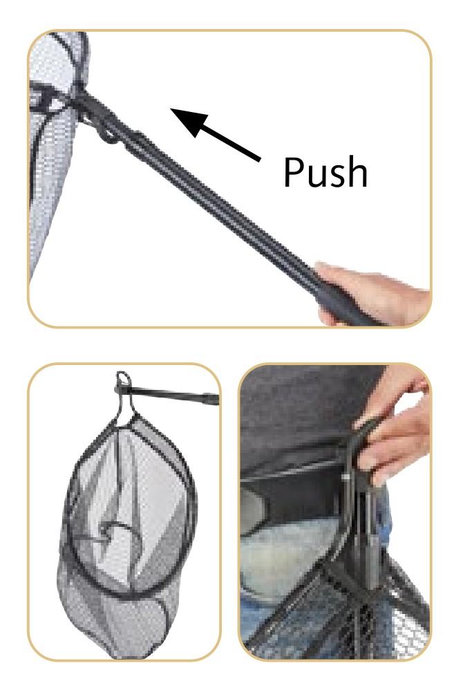 At the touch of a button, the landing net automatically extends to its full length with the help of a spring mechanism.